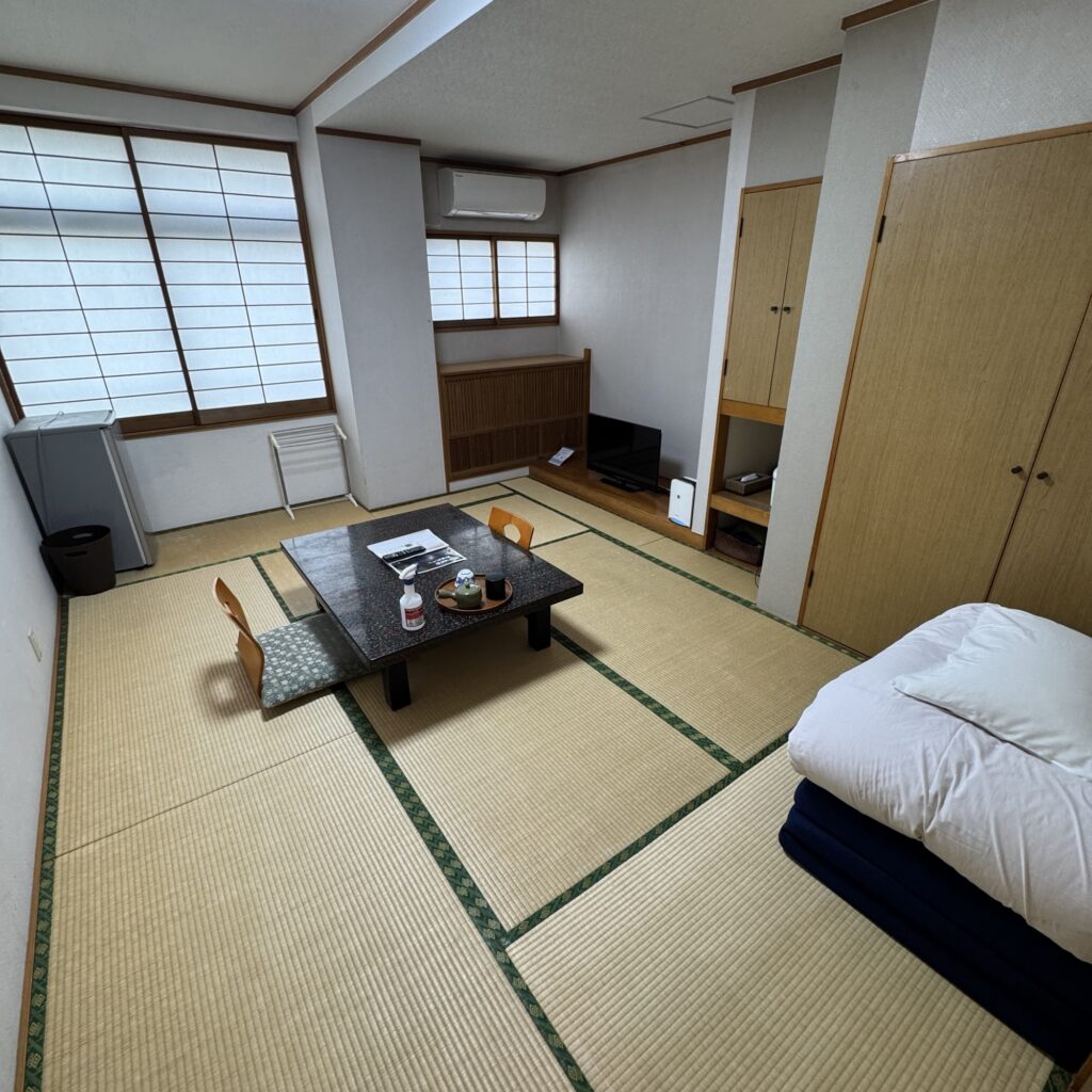 通された部屋は、実に潔い和室だ。 畳、座卓、テレビ、そして部屋の隅には一組の布団。 過剰なサービスも装飾もない。だが、それがいい。「あとは好きに過ごせ」と言われているような心地よい放置感がある。