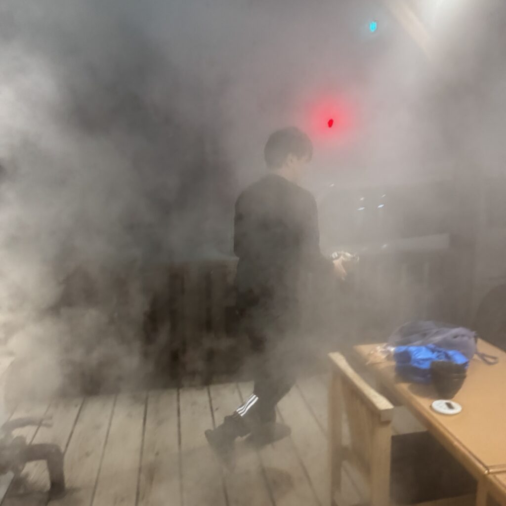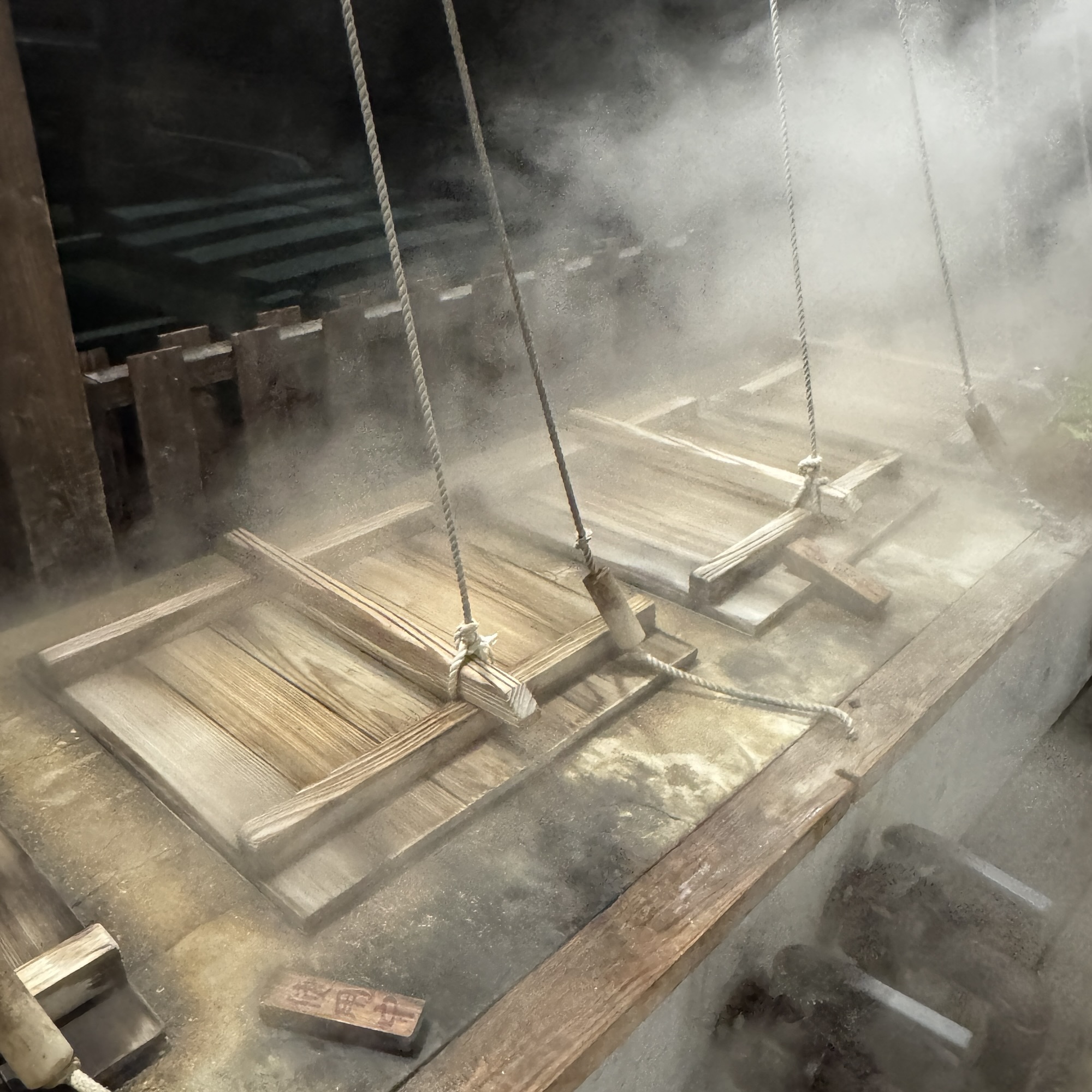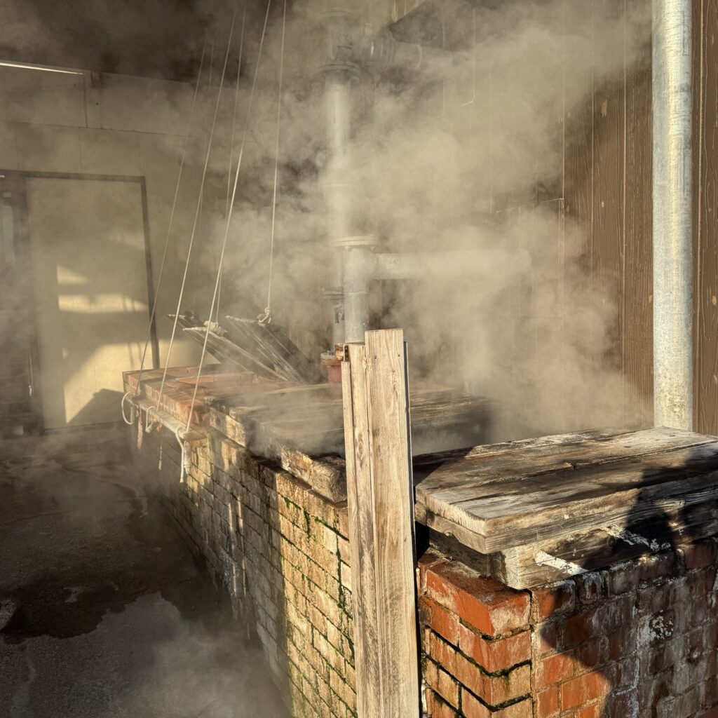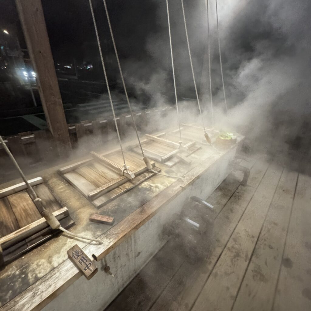 夕刻、いよいよメインイベントの開宴だ。 宿の中庭にある「蒸し場」へ向かう。 そこは、濛々たる白煙に包まれた異空間だった。 配管から轟音と共に噴き出す蒸気。硫黄の香りが微かに漂う。これは単なる調理器具ではない。地球の排気口だ。