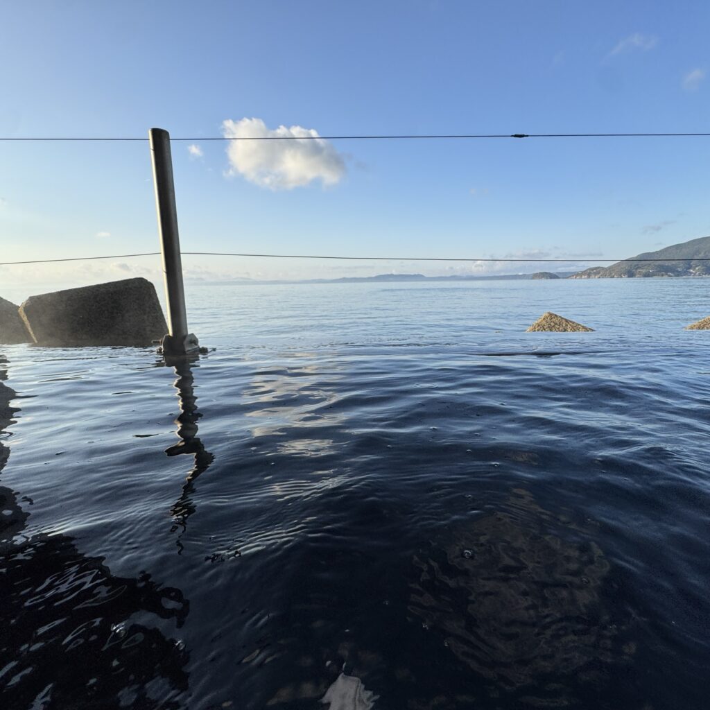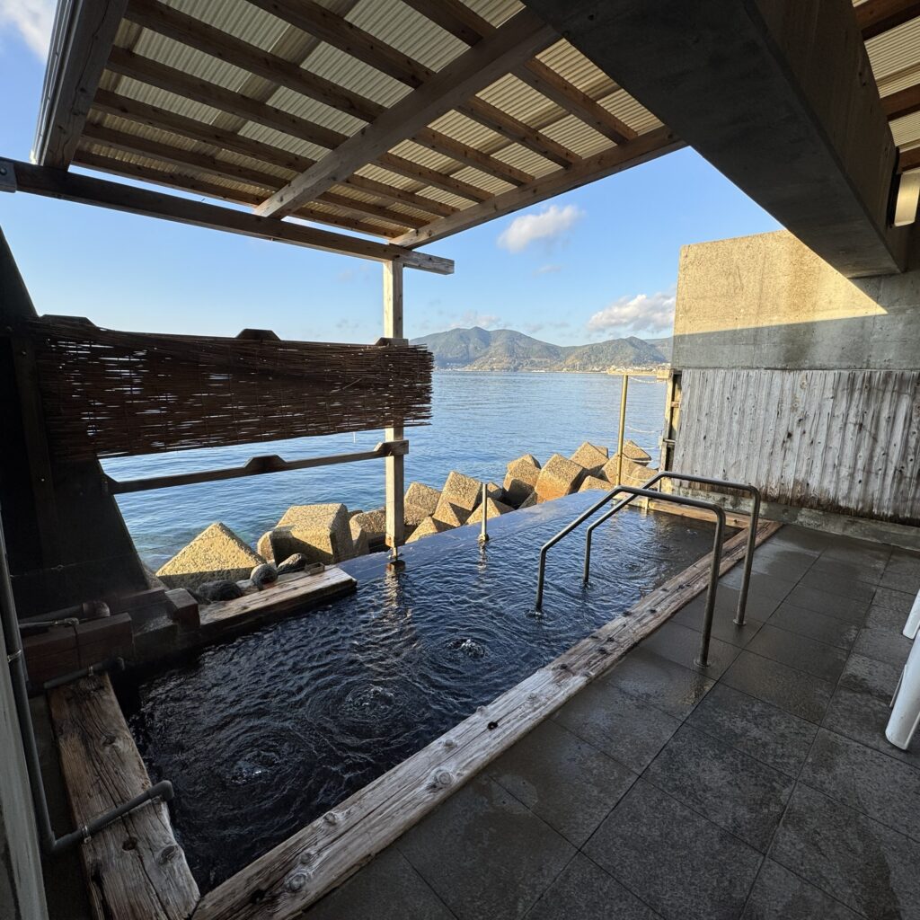 食材の仕込み(と言っても洗って切るだけだが)の前に、まずは身体を清める。 宿から歩いて数分、貸切風呂「波の湯 茜」へ。 海沿いの防波堤の向こうに作られたこの露天風呂は、まさに絶景だ。 湯船に浸かると、目線は水平線とほぼ同じ高さになる。 波音と風、そして塩分を含んだ熱い湯。 BEARDでの知的興奮を鎮め、身体を「野生」モードへとチューニングしていく。