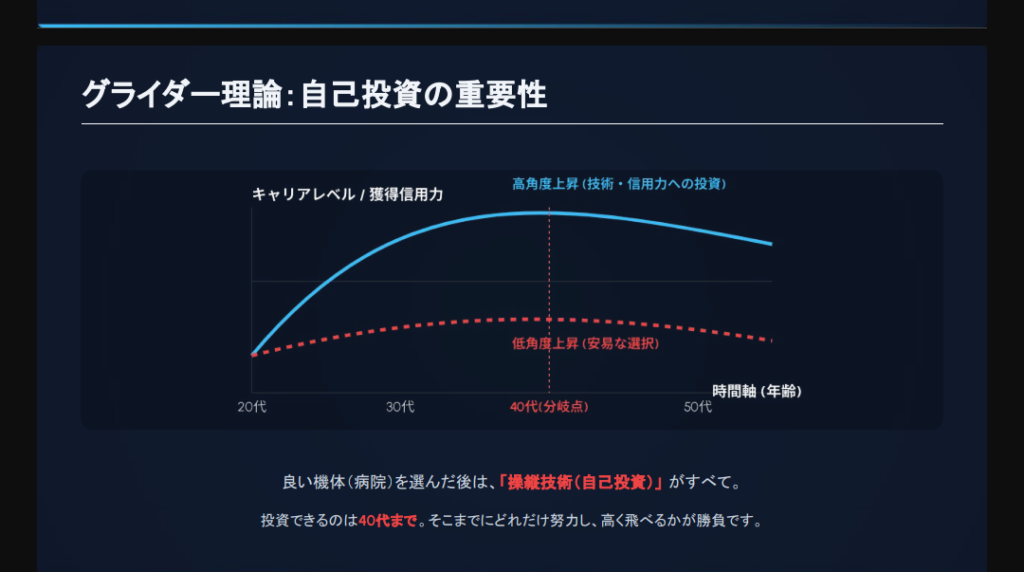 私が「グライダー」に例えるのは、人生には**「自力で高度を稼げる期間」**が決まっているからだ。グラフにある通り、勝負は40代まで。そこまでにどれだけ努力し、気流を掴んで高く飛べるか。それが人生後半の景色を決める。